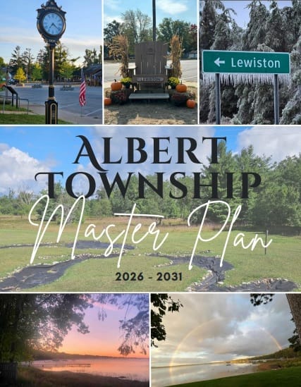 The 2026-2031 Albert Township Recreation Plan draft is now available for a 63-day public review and comment period. The draft plan can be viewed at the Township offices in Lewiston during normal business hours or can be downloaded from the Albert Township website. Comments can be submitted at the Albert Township office during normal business hours. Written comments may be sent to Albert Township, Attn: Jeff McDonald, PO Box 153, Lewiston MI 49756